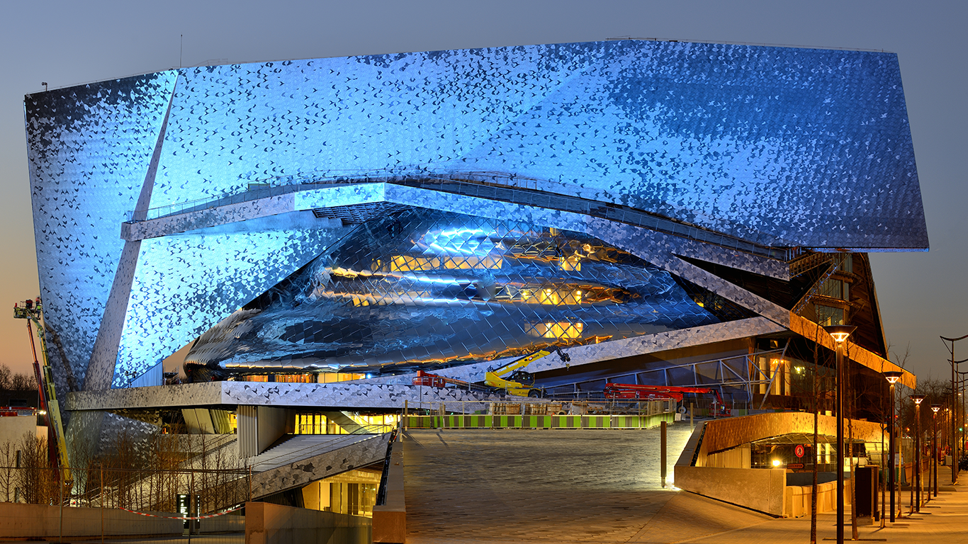 Des rubans décoratifs sur le Latitude, aux écailles d’oiseaux stylisés qui recouvrent la Philharmonie de Paris en passant par les formes asymétriques de Bridge :