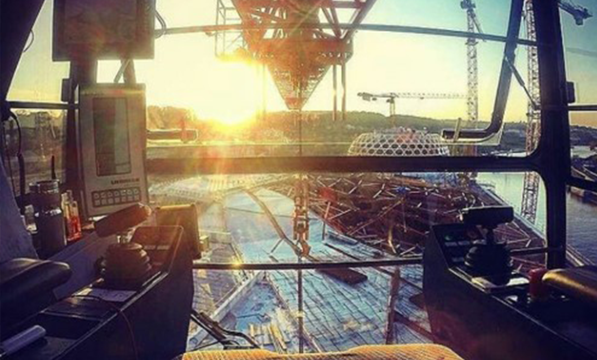 Notre grutier nous offre une immersion totale à l’intérieur de sa cabine. De quoi s’imaginer aux commandes de sa grue pour la journée devant ce chantier : l’avez-vous reconnu ? Un indice : il comprend un auditorium structuré par une charpente de bois. Bravo il s’agit de l’emblématique Seine Musicale réalisée par nos équipes en 2017.