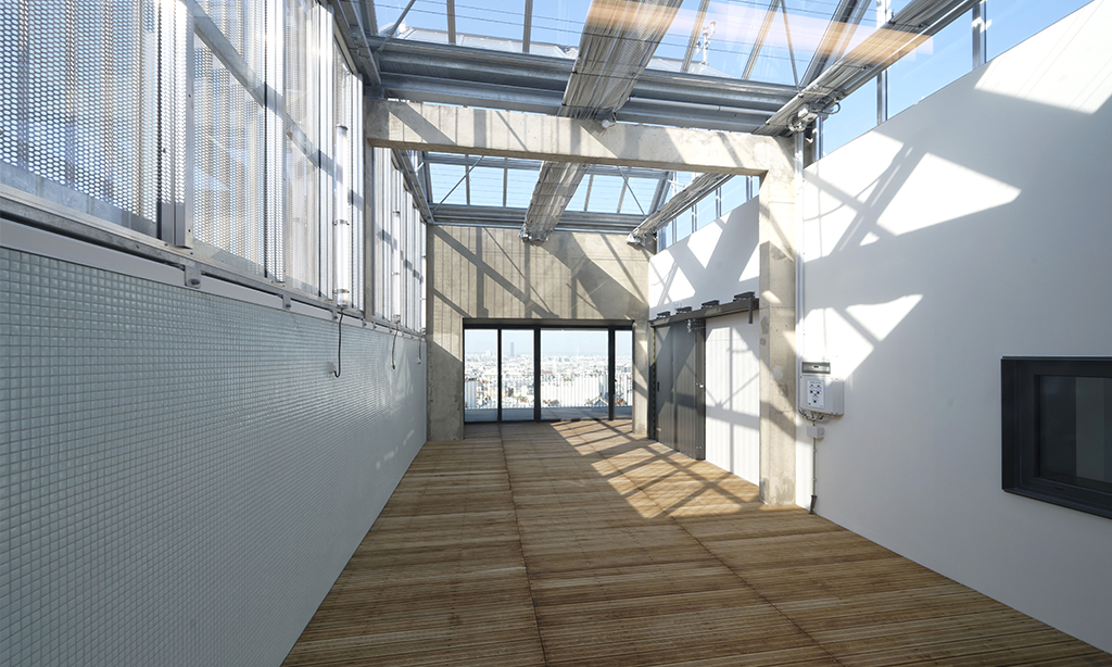 Dans une perspective de rendre l’habitat urbain plus nourricier, la toiture du bâtiment est dotée d’une serre agricole autonome et des jardinières intérieures se trouvent dans les duplex.