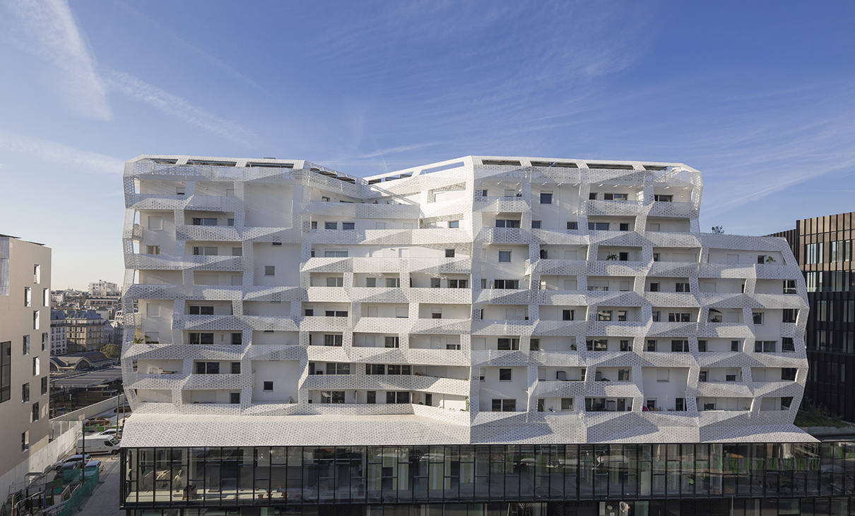 La silhouette découpée des programmes de logements permet une transition douce entre le Paris haussmannien et le nouveau quartier, la trame sobre des façades en béton blanc faisant écho à la pierre du vieux Paris.