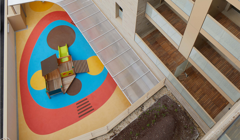 Logements et crèche rue Paul Bert : ce projet comprenant une crèche de 60 berceaux a été réalisé avec WeWood, pôle de compétences bois de Bouygues Bâtiment France à Issy-les-Moulineaux. Labellisé Bâtiment « biosourcé » de niveau 3, le projet est conçu avec une structure mixte béton et bois : les infrastructures, le rez-de-chaussée et les noyaux de circulation verticaux sont en voiles de béton armé, les refends intérieurs et murs de façades sont en structure bois CLT et les planchers des niveaux supérieurs en bacs collaborant + faux plafond BA13. Sa façade est réalisée avec une vêture de plaquettes de terre cuite. (Maîtrise d’Ouvrage : Seine Ouest Habitat et Patrimoine / Maîtrise d’Œuvre : Daquin & Ferrière).