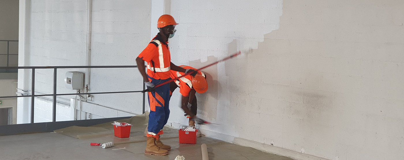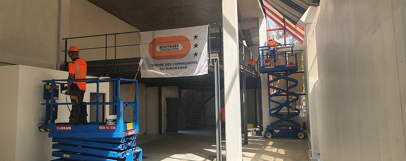 Cette action, portée par l’Ordre des Compagnons du Minorange de Bouygues Bâtiment Ile-de-France et Bouygues Construction Matériel, a rassemblé plusieurs personnes engagées individuellement et s’est réalisée en collaboration avec les équipes de Bouygues Bâtiment Ile-de-France – Construction Privée. Encadrement, Maîtrise, Compagnons : tous se sont mobilisés. Les chefs de chantier ont prêté leur nacelle et fourni le PVC. Et nos partenaires aussi ont joué le jeu ! Saga-Plus nous a fourni généreusement la peinture et Bouygues Construction Matériel les rouleaux de peinture.